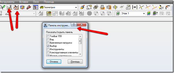 Добавим недостающие панели Редактирование и Опции для генерации сетки. Это можно сделать нажав кнопки на главной панели или с помощью диалога Инструменты –Настройка – Показать панель инструментов, отмечая нужные пункты: