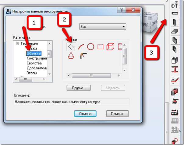 Выберем в меню Инструменты – Настройка – Настроить панель инструментов или щелкнем правой кнопкой мыши по существующим панелям. В появившемся диалоге выберем, например категорию Геометрия – Объекты и перенесем кнопку Полилиния-Контур на панель инструментов Модель конструкции:
